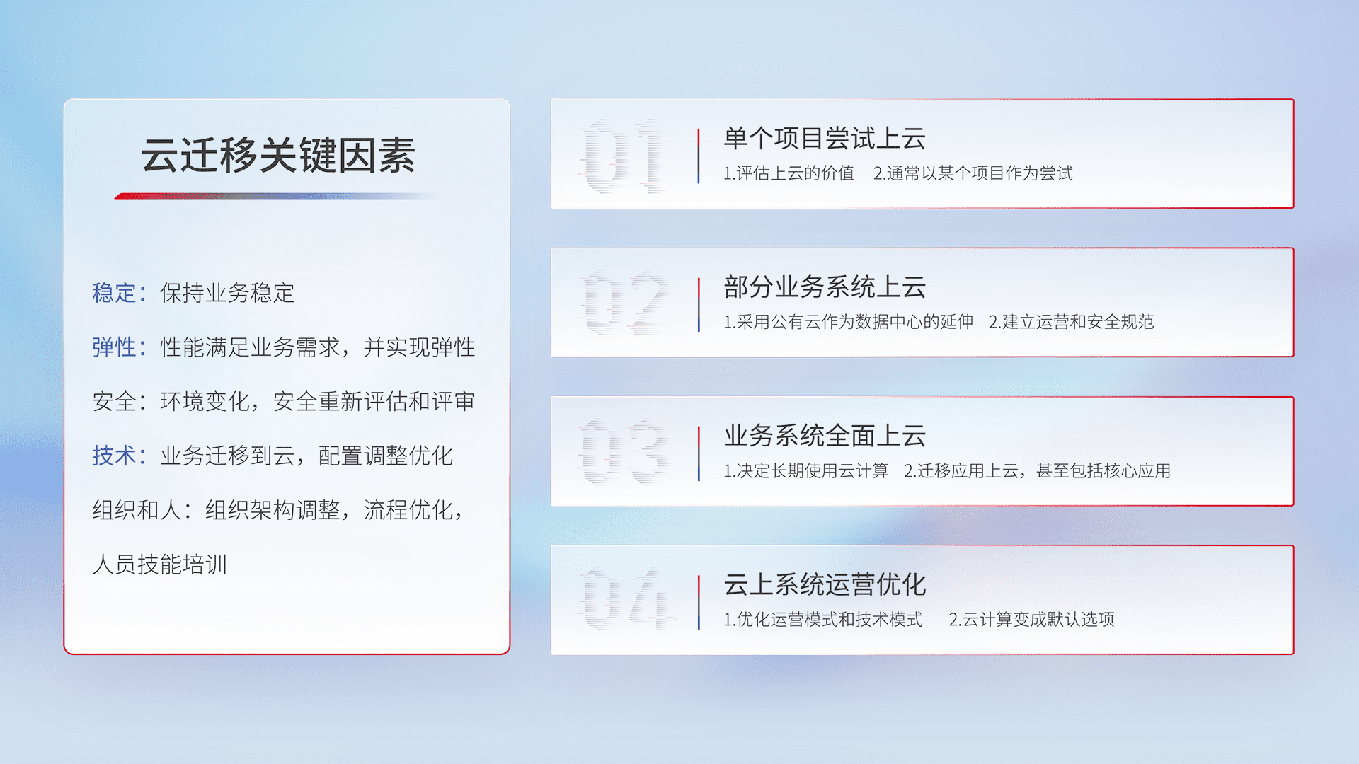 结合实际业务,,从规划设计、、、云平台选型、、、、云原生改造、、、数据迁移、、、、集成交付,,,,迁移全过程为客户识别最佳上云路径,,,做好风险识别管理,,设计网络架构、、、身份权限、、、安全审计合规、、操作审计、、、、日志审计、、、、监控告警策略、、多站点容灾设计等,,对云上基础设施进行整体规划,,,,提升IT治理水平,,,以满足弹性、、、、高可用、、、、高性能的需求。。