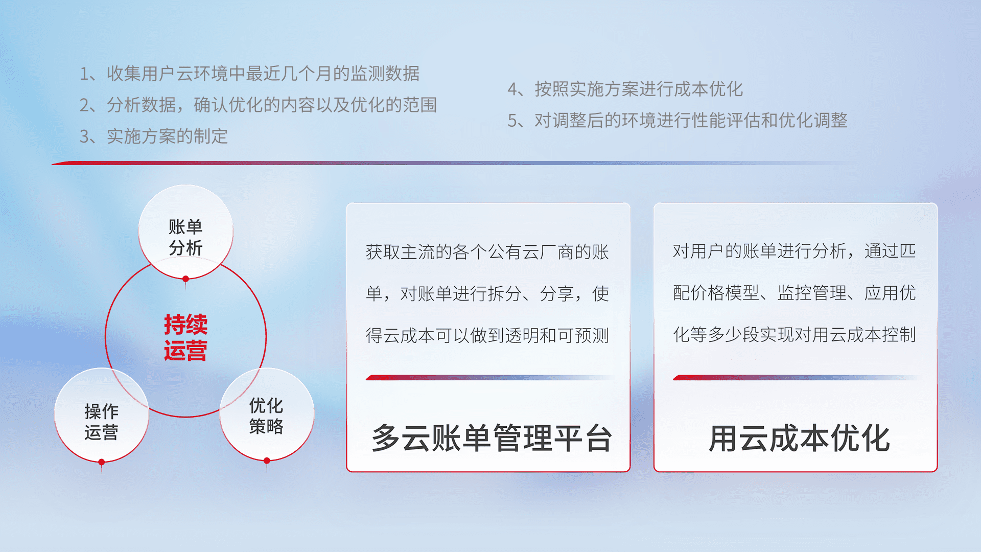 通过多云纳管,,以统一的资源数据模型把客户的云资源进行抽象和封装,,,,进而实现对多云资源的统一操作,,,保障云资源管理的可靠性、、、稳定性与可用性。。量身定制化运维内容,,配置、、、开发运维、、、补丁管理、、、、备份、、、、监控、、认证和访问管理、、审计和日常巡检等,,,,保障在用云过程中的可靠度,,稳定度以及高可用率。。。